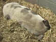Im Stall schläft ein Schwein mit dem Rücken zur Kamera, Handheld