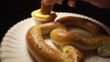 Slow Motion Close-Up Makro Weitwinkel-Aufnahme einer kaukasischen Hand Tauchen ein Stück köstlichen Riesen gesalzenButterbrezel mit einer vollen Tasse gelbe Nacho Käse Dipping Sauce auf einem Papierteller