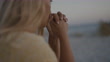 Zeitlupenansicht einer nachdenklichen Frau, die am Strand von Sardinien sitzt. - 4K Stock-Video