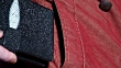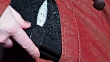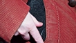 Human hand putting leather wallet in pocket of rusty corduroy jacket with copper buttons. Close-up