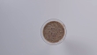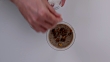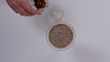 Adding chocolate granola and coconut grating as garnish on a fruit smoothie based on banana and blueberries.