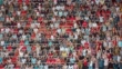 Wide locked down shot of the spectators at the sporting event performing the Mexican wave from right to left and backwards. Shot in Austria.