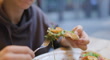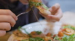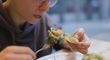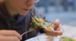 Teenager genießt es, Garnelenpizza in einem Restaurant zu essen. - 4K Stock-Video