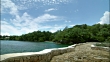 WS Terraced stone wall waterbreak bordering ocean near lush trees / Ocho Rios, Jamaica - HD Stock-Video