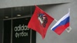 The flag of the Russian Federation, right, hangs alongside a flag of St George outside the Adidas AG sportswear store in Moscow, Russia, on Friday, May 2, 2014, Adidas signage outside store, Pedestrians walk past Adidas store, Customers enter store, An Adidas FIFA World Cup Brasil football sits on display amongst other 2014 World Cup sportswear, The coat of arms of the Russian Federation sits on an item of sports clothing, A Russian World Cup 2014 sports jersey hangs on display, An Adidas Brazuca World Cup football sits on display, Customers pay for their purchases at checkout counter