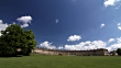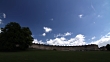 Zeitrafferwolken am blauen Himmel über dem Royal Crescent und dem Victoria Park in der georgianischen Stadt Bath, Großbritannien.