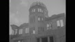 Title superimposed on a flyover of the devastated city: "Hiroshima - Nine years after A-Blast" / Rubble and destruction on the ground; new construction at the Ota River / Several women walking to the Peace Bridge, some with parasols / Shots of the wire dome of the Hiroshima Peace Memorial / More people on the bridge / A man places a wreath at the Memorial Peace Park / Numerous spectators under a tent / Princess Kikuko bows / Schoolchildren pray; a crowd stands, some burning incense; two women praying; an older person with incense / Portions of the reconstructed city / Exact day not known