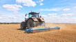 Tracking shot of tractor pulling disc harrow across dry field under cloudy sky on sunny day. Farming equipment breaks up soil for planting, leaving textured surface behind. Rural landscape shows active land preparation with mix of sunlight and cloud cover over open farmland.