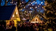 Crowd of People moving over a Christmas Market with beautiful decoration and illuminated market stalls at dusk. Shot in Cologne, Germany.