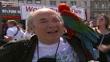 World Parrot Day: Trafalgar Square event; ITNENGLAND: London: Trafalgar Square:EXTTGV Trafalgar Square TILT DOWN crowd of people gathered for World Parrot Day event CMS Blue parrot on man's shoulder as girl feeding parrot PAN Basket of nibbles held TILT UP red & green parrot being fed'Born to be wild' sign TILT UP men posing with parrot figureRed parrot biting camera tripodMS Illustrator Quentin Blake sketching parrot as red & green parrot perched on his shoulderCMS Sketch pad held as Blake drawing parrot(World Parrot Day GVs= 30 secs)Quentin Blake (Illustrator) interviewed SOT- Discusses World Parrot TrustCMS Blue & yellow parrot i/cMS Alan Jones (Chairman, Parrot Society UK) holding parrot in fleecy blanket as sitting on open-topped busCS Parrot in blanketAlan Jones (Chairman, Parrot Society UK) interviewed SOT- Parrots are still being taken from wild at an alarming rate, and although their habitat is being detsroyed, taking them from it is not the way to go'Save the parrots' petition Parrot enthusiasts marching along on journey to Downing Street to hand in petition (2 SHOTS)