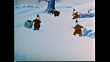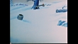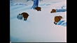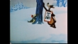 / Turkey dives from one hiding place to another in the snow as pilgrim searches angrily for him / pilgrim sticks his head in tree log and turkey whistles at him mockingly from a distance / bear leans against a tree nonchalantly holding a sign that reads: 'EAT AT JOES' / turkey climbs the tree to escape angry pilgrim / pilgrim climbs after him. Turkey hiding from pilgrim chasing him on January 01, 1945 (Footage by Getty Images)