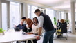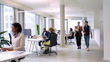 Two business people walking into office, arrive at desk and assisting colleagues at startup. Multiracial business people working at open plan office space.