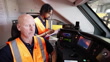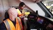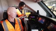 Zwei Wartungsingenieure überprüfen die Geräte des Steuerzugs in der Fahrerkabine - 4K Stock-Video