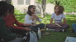 A small group of University students sit outside on campus as they take a break together between classes. They are each dressed casually as they talk and catch up.