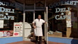 Wide shot man opening door of delicatessen and standing in doorway / looking up + down street - HD Stock-Video