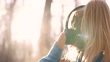 SLO MO Frau setzt Kopfhörer auf ihren Kopf, während sie im Wald ist - 4K Stock-Video