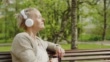 Handheld footage of a woman is sitting on a park bench in a public park. She is enjoying the sun and listening to music.