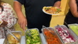 Frau serviert Salsa Verde über ihren mexikanischen Tacos in einem mexikanischen Buffet - 4K Stock-Video