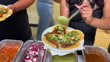 Woman serving salsa verde over her Mexican tacos in a Mexican food buffet