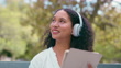 Damen-, Tablet- oder Kopfhörer auf Parkbank, Garten- oder Naturmöbeln für Musik, Radio oder Relax-Podcast. Lächelnder, glücklicher oder schwarzer Schüler, der Audio-App, Self-Care-Sound oder Medien für psychische Gesundheit hört - 4K Stock-Video