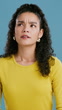 Woman, thinking and doubt in studio with idea, problem solving and decision for a choice or problem. Stress, mindful question and female person with wondering why and blue background with solution