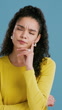 Frau, Denken und Zweifel im Studio mit Idee, Problemlösung und Entscheidung für eine Wahl. Planung, achtsame Frage und ernsthafte weibliche Person, die sich fragt, warum und blauer Hintergrund mit Lösung - 4K Stock-Video