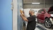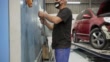 Arbeiter steckt ein großes Schweißgerät in eine Steckdose in einer großen Karosseriewerkstatt