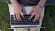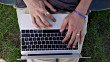 Young man working on computer at grass directly above HD video stock. Footage filmed at Barcelona on July 2017.