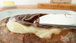 A close up clip of butter and yeast extract being spread over a slice of sourdough toast. Shot on a clean porcelain plate, with a wooden bread board and small butter dish in the background.