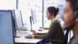 Wide shot of a young Caucasian female call center customer service representative talking to a client with her wireless headphones sitting by the computer at her workstation. Shot in Slovenia.