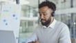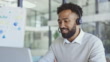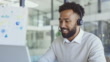 Junger, fröhlicher, gutaussehender männlicher Callcenter-Agent, der Anrufe entgegennimmt und bei der Arbeit ein Headset trägt. Fröhlicher männlicher Geschäftsmann, der alleine in einem Büro telefoniert. Ein Geschäftsmann, der alleine arbeitet