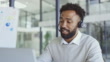 Junger, glücklicher, gutaussehender männlicher Call-Center-Agent, der Anrufe entgegennimmt und bei der Arbeit ein Headset trägt. Fröhlicher männlicher Geschäftsmann, der bei einem Anruf allein in einem Büro spricht. Ein allein arbeitender Unternehme - 4K Stock-Video
