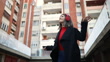 Young beautiful Caucasian woman listening music on her smartphone and dancing.