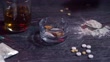 Junge Frau hält eine Zigarette und Whiskey mit Heroin, Spritze, Pillen, Drogen, Aschenbecher auf Holz braun Tisch. Zeitlupe, Löschen eines Zigarrenetts - HD Stock-Video