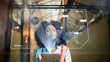 Junge Frau mit Augmented-Reality-Gerät, während sie im Büro spazieren geht - 4K Stock-Video